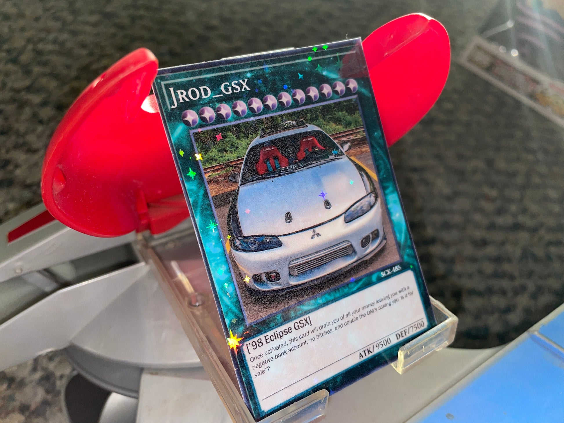 Custom-made Yu-Gi-Oh! card of your car, dog, cat or anything you want! You'll have the choice of choosing the card type, name, Attack/Defense values and the opportunity to make it completely unique with whatever description you'd like!
